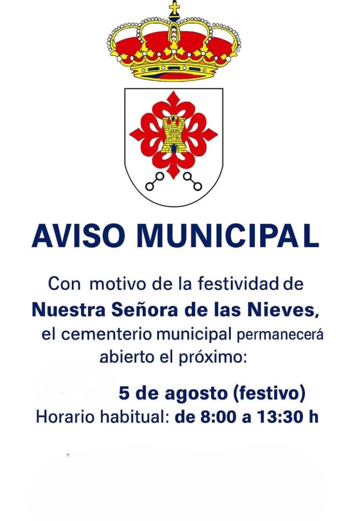 El próximo 5 de agosto, con motivo de la festividad de Nuestra Señora de las Nieves, el cementerio municipal permanecerá abierto al público en su horario habitual, de 8:00 a 13:30 horas.