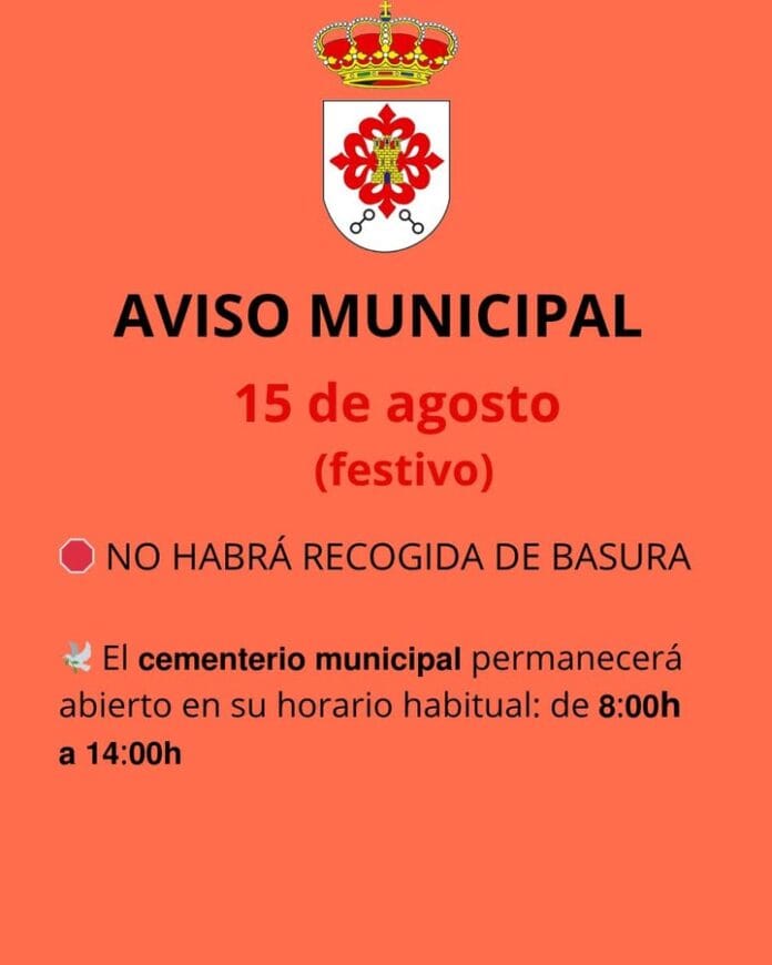 En el marco de la celebración de la festividad del 15 de agosto, se han emitido importantes avisos municipales para informar a la población sobre cambios en los servicios. En este día festivo, no se llevará a cabo la recogida de basura. Los residentes deben tomar las medidas necesarias para gestionar sus desechos hasta que se restablezcan las actividades habituales.