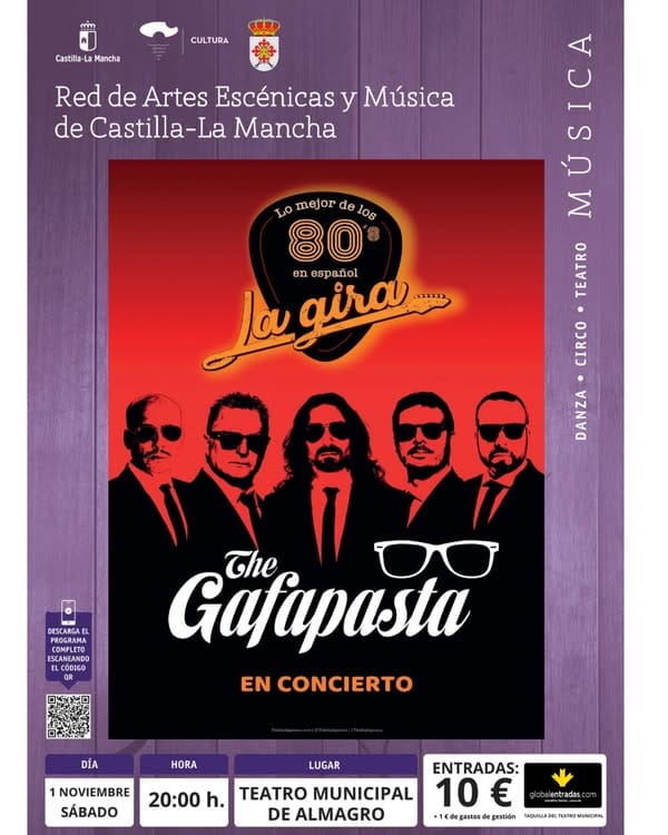 El próximo 1 de noviembre, a las 20:00 h, el Teatro Municipal de Almagro se llenará de nostalgia y ritmo con la esperada actuación de The Gafapasta. Esta banda, conocida por su enérgico directo, rinde un vibrante homenaje a la música española de los años 80. A lo largo de su trayectoria, más de 250.000 personas han disfrutado de sus potentes versiones de clásicos inolvidables.