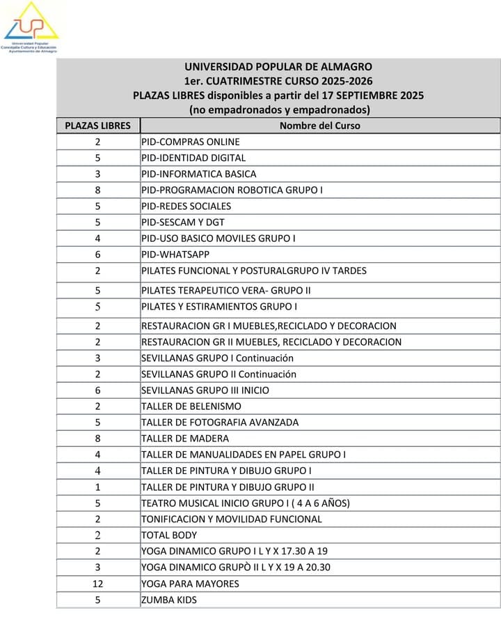 ¡Última oportunidad para inscribirse en la Universidad Popular de Almagro para el curso 2025-2026! La institución ha anunciado que a partir de hoy, 17 de septiembre, se actualizan las plazas disponibles para los interesados en formar parte de su oferta académica.